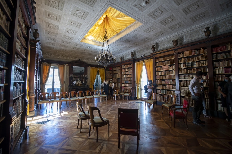 The interior decoration has evolved over time. Guillaume Favre, for example, refurbished the louis XVI main sitting room in to Empire style. He also redecorated the bedrooms on the upper floor. The interior is now mainly as it was when left to the city around the end of the first world war. The main achievement Guillaime Favre did was the library, its interior and the books. During the first half of the 19th century, he collected over 12,000 volumes kept in three adjacent rooms on the ground floor, two of which were transformed for this function, and a fine, large, rectangular purpose-built annexe with a flat roof on the right hand side of the villa. The addition of a pergola around it in 1854 was the work of his son Francois Edmond. Inside, the empire style bookcase reach almost the painted tromp-l’oeil ceiling. Antique vases, tables busts and sculptures decorate the space. Those fortunate enough to enter the holy of holies are struck by the beauty of the gilded leather spines of so many books. Yet it was not only for the aesthetic reasons that Guillaume Favre assembled this rich collection. He was one of the founders of the reading society and the History and Archaeology society. He was also board of Geneva library. His library was first and foremost a working tool. Half of the books were printed in the first half of 19 century. The oldest however, the incunabula, date back to the fifteenth century, prior to the invention of printing. Nowadays enlightened amateurs or researchers may ask to consult these works at the Geneva Library.